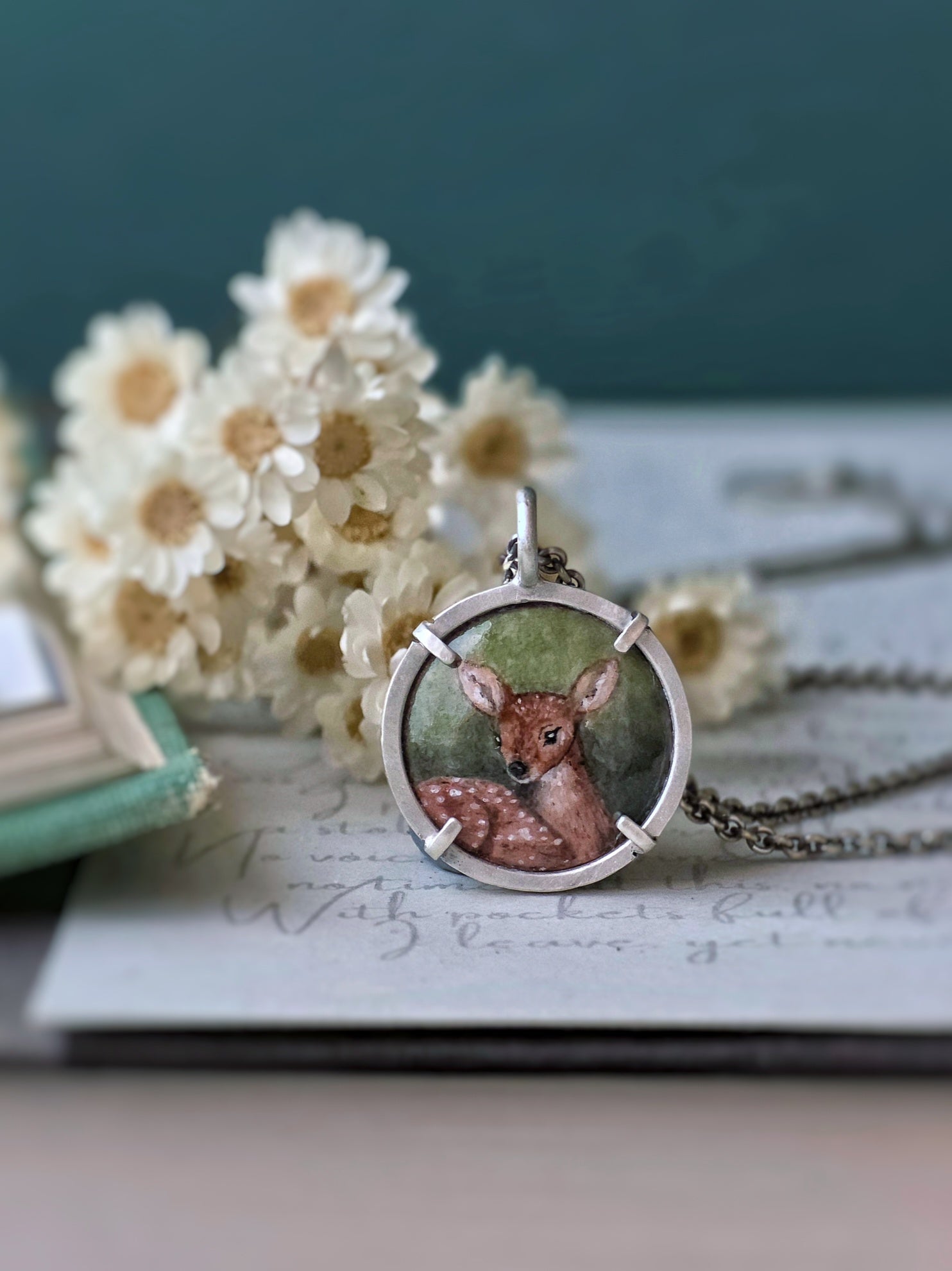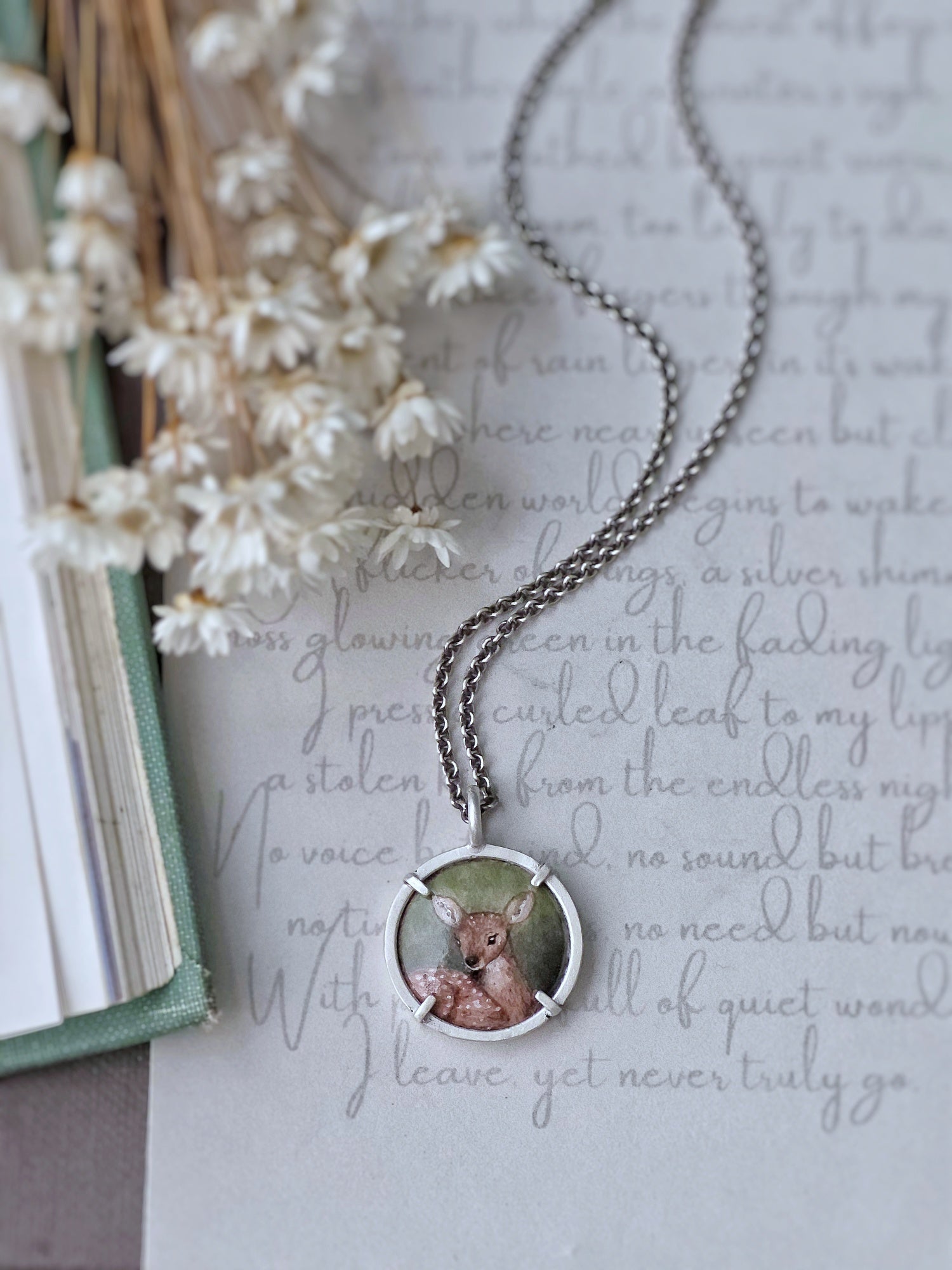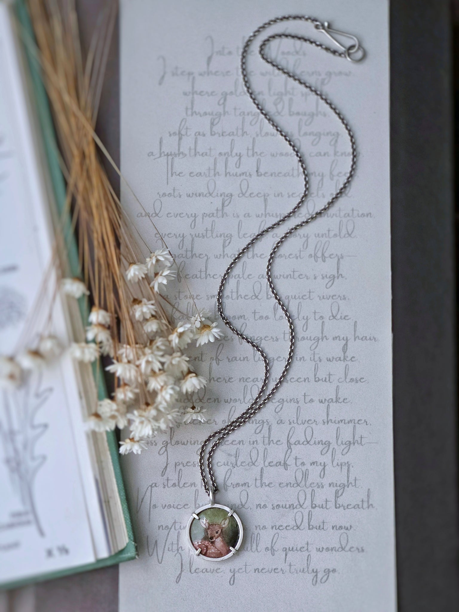 This little fawn is painted entirely by hand in vitreous enamel, resting in fresh green growth, like the first real sign that winter is loosening its grip. February may still feel heavy, but the light is changing. The season is turning.