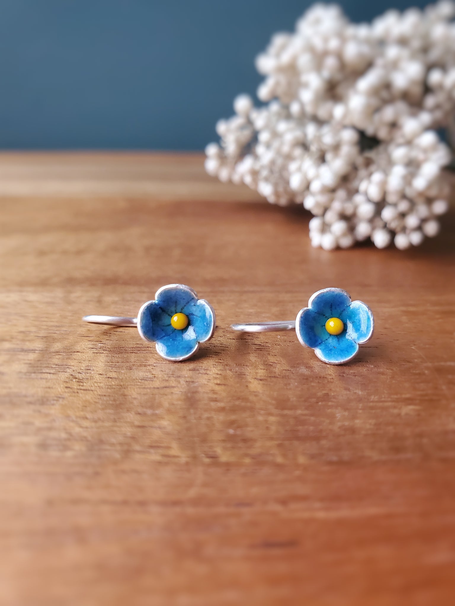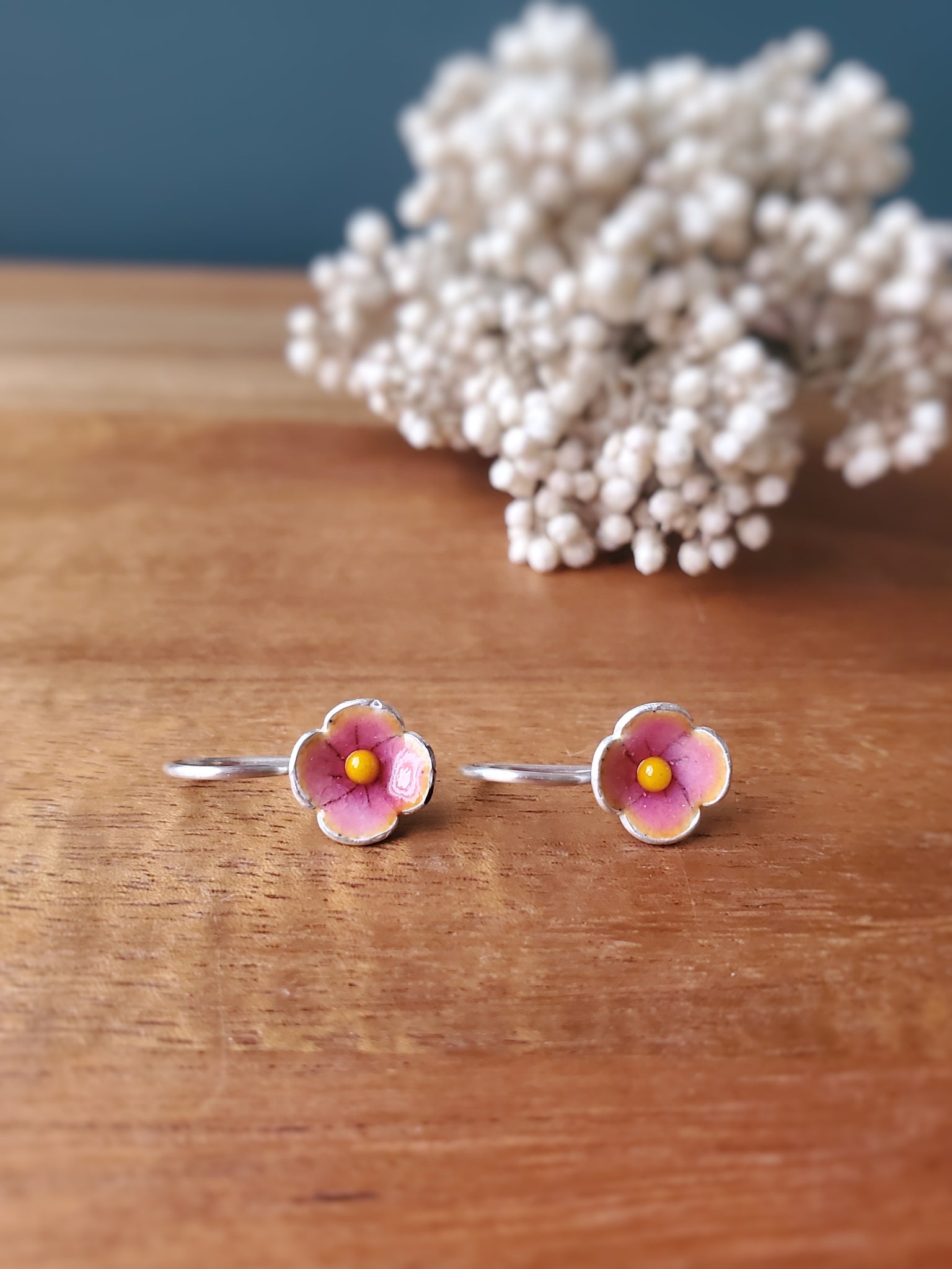 These flowers are just the cutest and will surely bring a smile to your face! With four gorgeous enamel colors to choose from - White, Pink, Purple, and Blue - you'll have a blast finding your favorite. The dainty flower hangs from a tiny hook that keeps it snuggled up to your earlobe, creating a fun hoop-like effect. And the best part? They're oh-so-comfy and lightweight; you'll hardly notice them there! These cheerful earrings are crafted from high-quality sterling silver and colorful vitreous enamel which are slightly oxidized to highlight the intricate details, making them absolutely stunning. Get ready to fall in love with them!