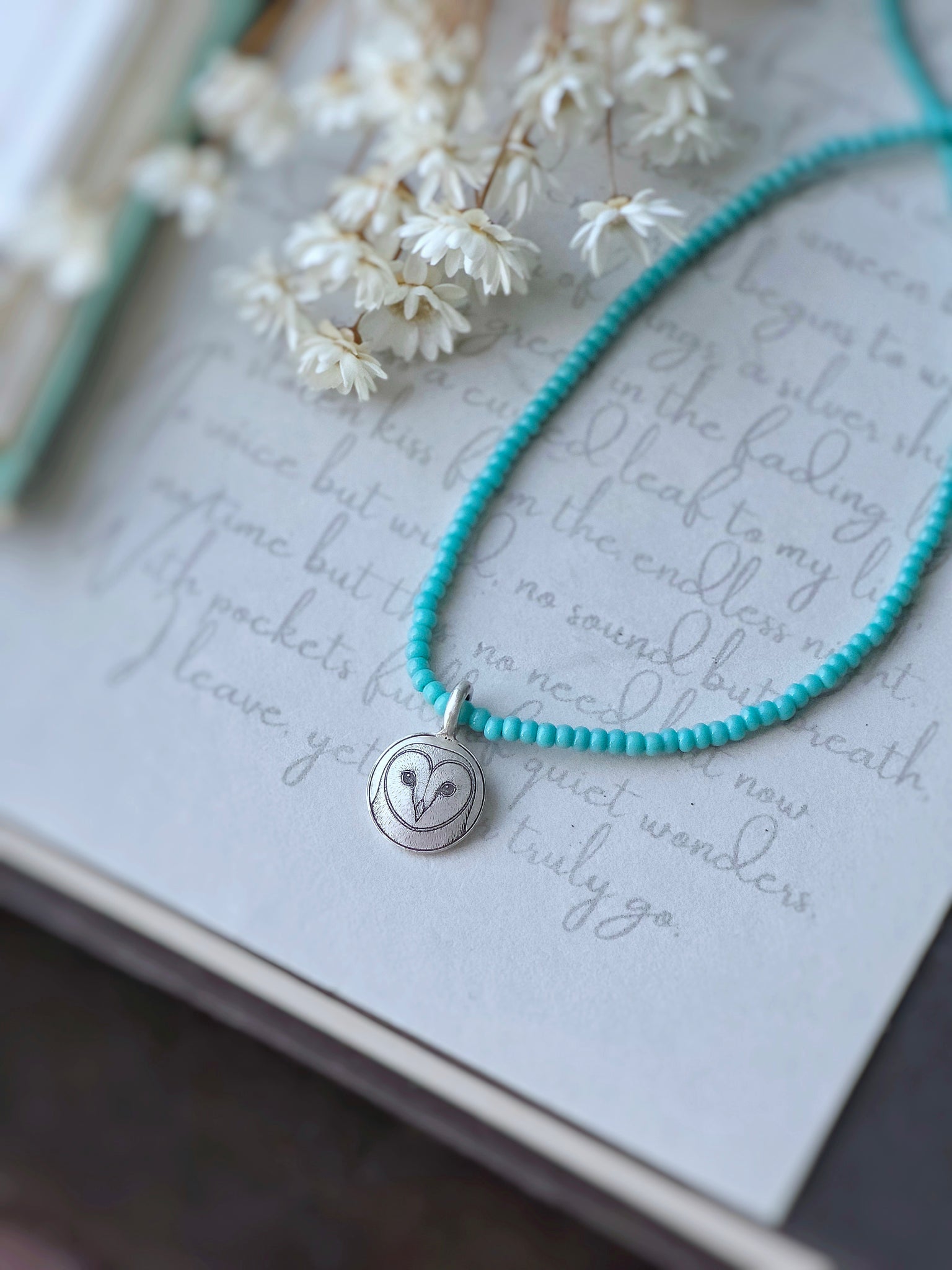 Once ordered, your little sterling silver owlet will be made just for you. Each one is carefully crafted by hand using turquoise seed beads on natural silk cord and finished with a sterling silver hook and eye clasp to keep the necklace lightweight, flexible, and comfortable for everyday wear. If you’d like any further customization, please feel free to reach out.